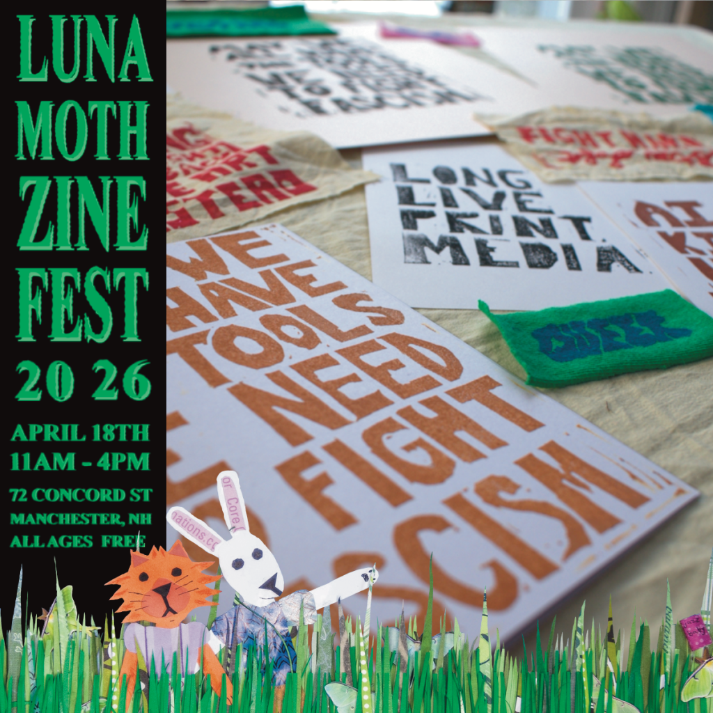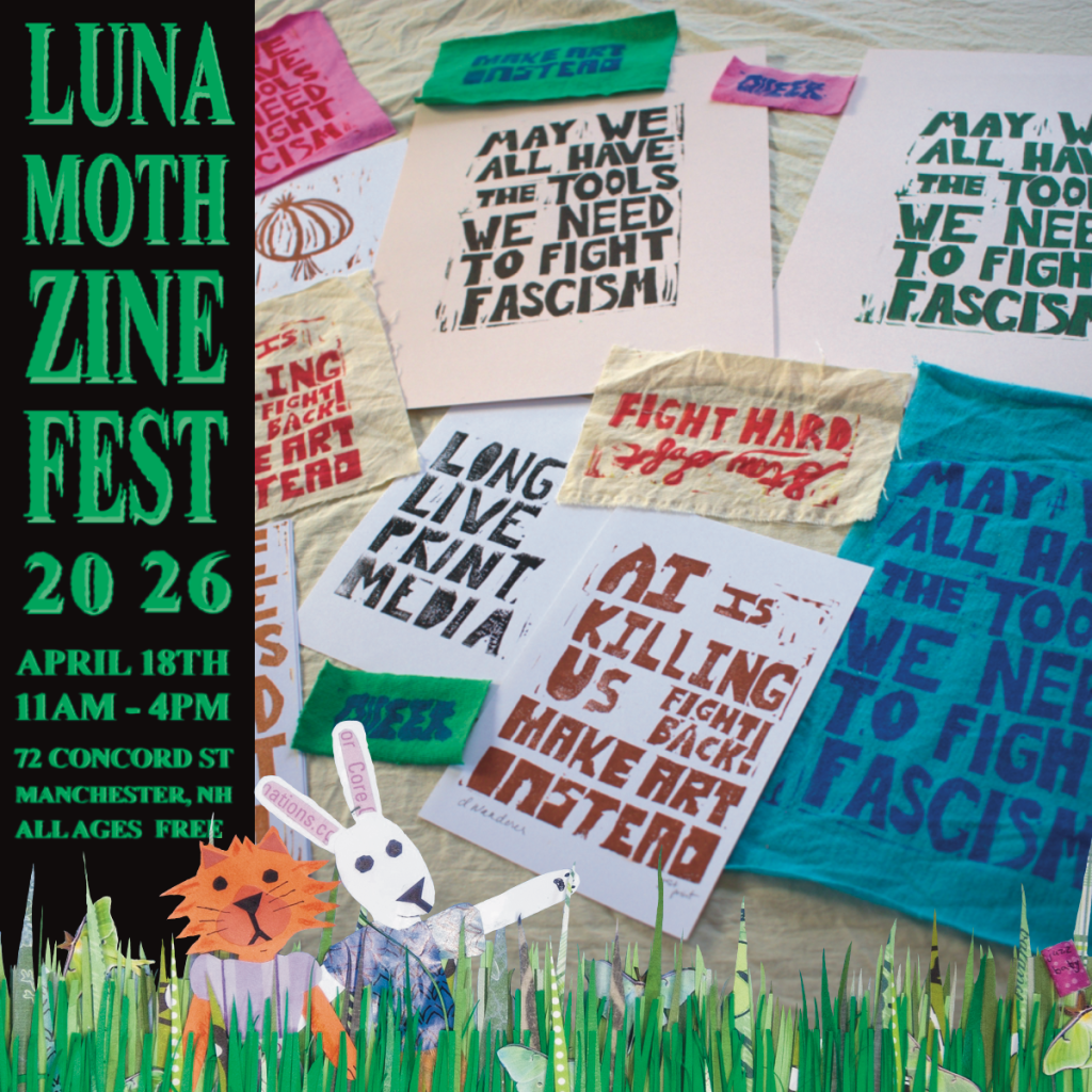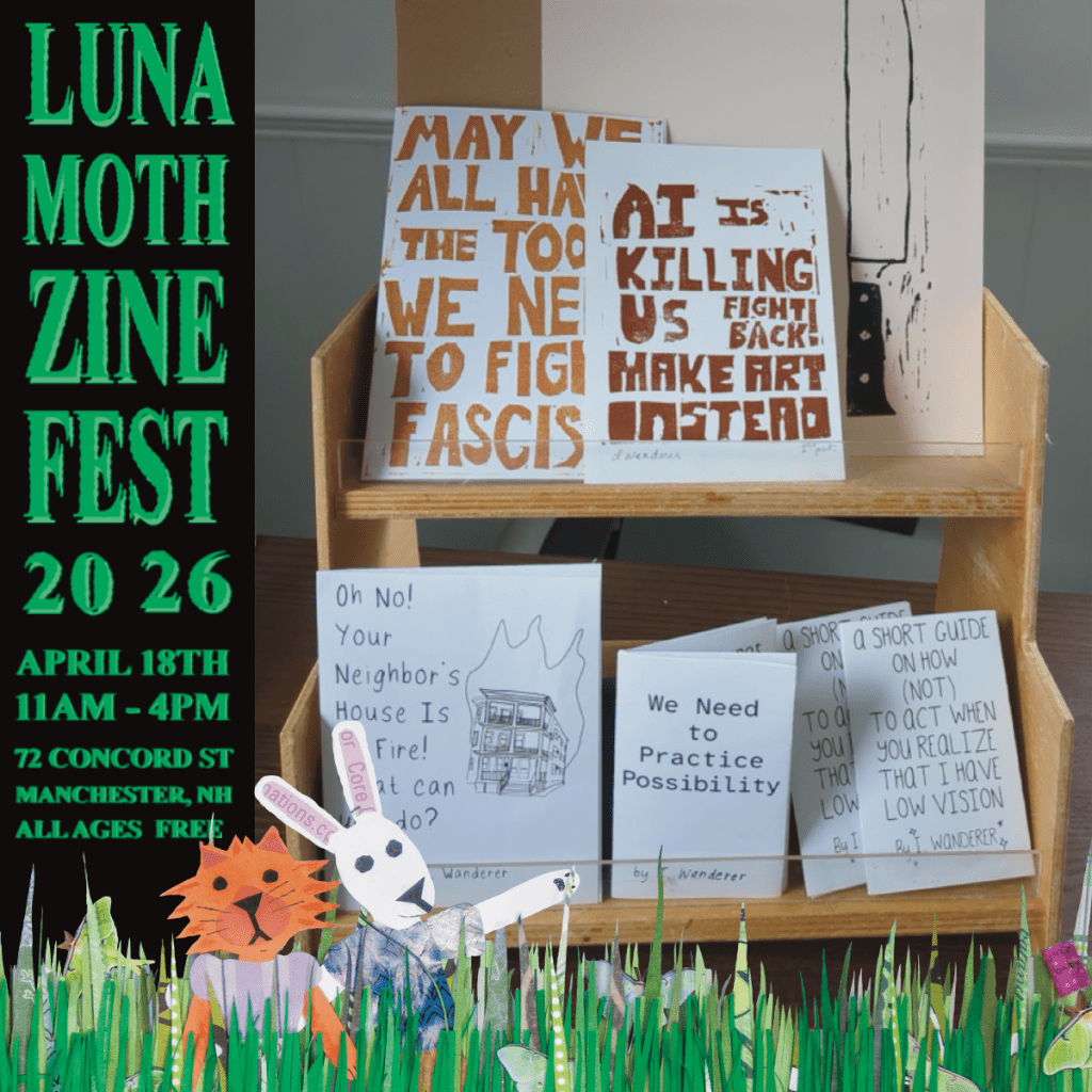 I draw from a variety of techniques, materials, themes, and ideas, often letting the tools and secondhand materials I have guide me in what I create. I will be selling auto-bio/memoir zines, zines about mutual aid and liberation, and some reflective art zines, as well as prints, patches, stickers, clothing and some other goods! And, feel free to bring me some trash, I’ll make it into art.